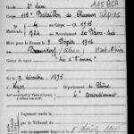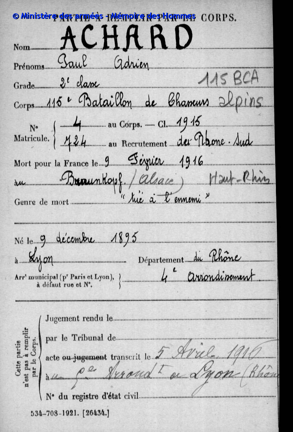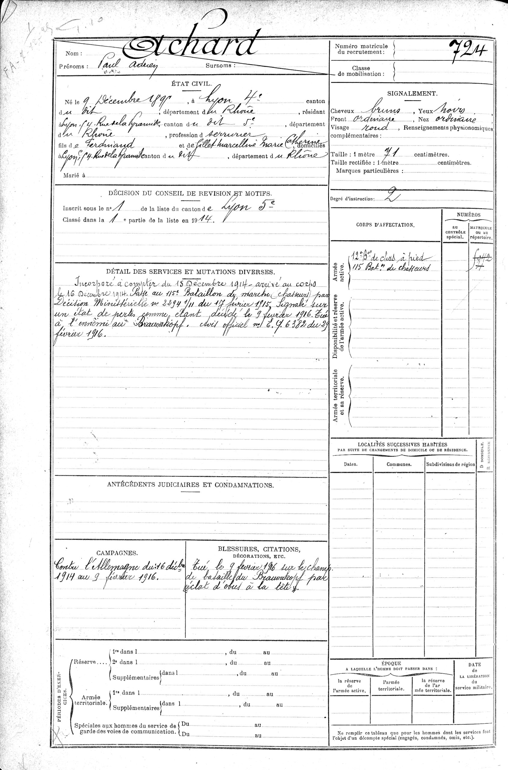 Paul Adrien Achard nait à Lyon 4ème, le 9 décembre 1895. Peu instruit, il sait lire et écrire mais n’est pas doué en calcul ce qui ne l’empêche pas d’être serrurier à Lyon avant-guerre. De la classe 1915, il est appelé au 115ème Bataillon de Chasseurs Alpins alors qu’il vient de fêter ses 19 ans. Pris dans la Grande guerre, il est tué après une année de combats sur le champ de bataille du Braunkopf à Metzeral (Haut-Rhin) par un éclat d’obus à la tête, le 9 février 1916. Il est d’abord enterré au cimetière de Mittlach avant que son cercueil ne soit transféré en juillet 1924 au cimetière de Vénissieux, à la demande de la famille qui devait y posséder une concession. Lyon reste sa ville de rattachement et son acte de décès y est enregistré. Son nom figure sur l’Ile aux Cygnes du Parc de la Tête d’Or et sur le Livre d’Or de Lyon. On trouve aux archives de Vénissieux, l’acte de transfert du corps.