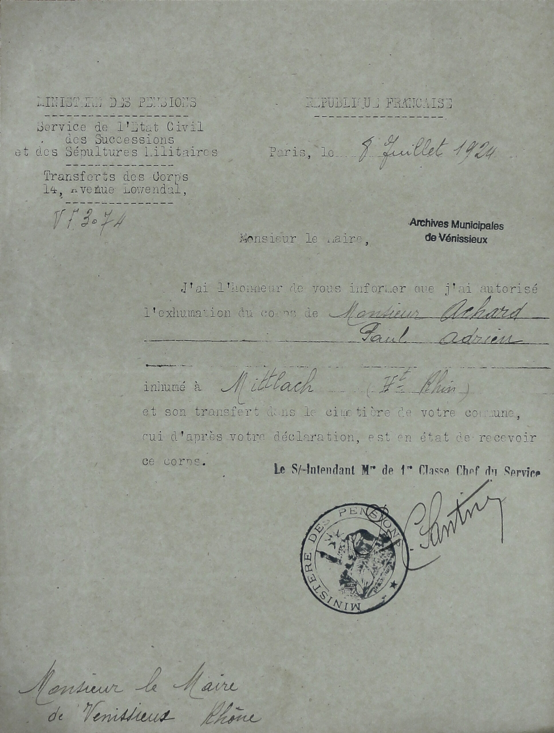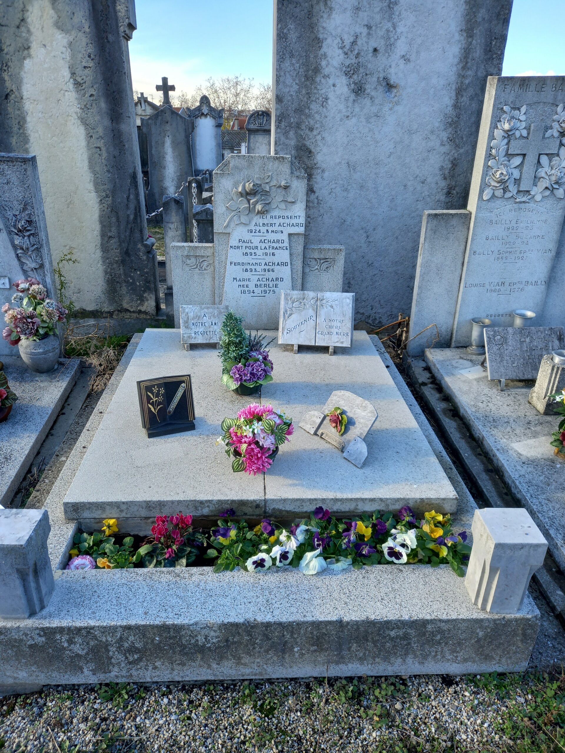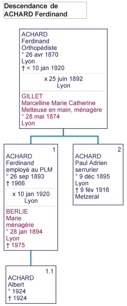 Une famille purement lyonnaise qui détient une tombe à l’ancien cimetière de Vénissieux. Paul  Adrien Achard est Mort pour la France…